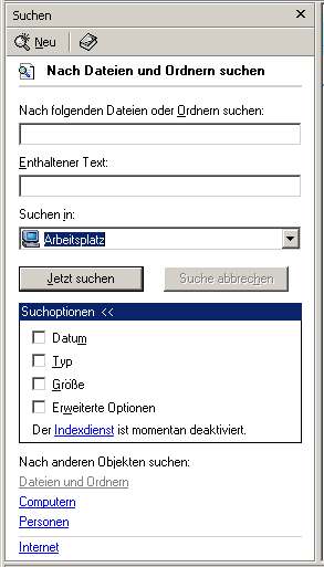 Diese Art der Suche kann sehr lange dauern, weil der Computer eine Datei nach der anderen in den Arbeitsspeicher laden und nach dem Suchtext durchsuchen muss!