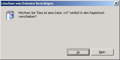 Dieses Bild erscheint immer dann, wenn eine Datei endgültig gelöscht wird. Wenn du auf Ja klickst, ist sie danach wirklich weg, so als hättest du ein Papierdokument durch den Reißwolf gedreht. Nur noch mit Hilfe spezieller Programme kann man die Datei jetzt noch wiederherstellen; das ist mühsam und aufwändig und klappt auch nicht immer - einfacher ist es, vor dem Klicken einmal nachzudenken, ob man diese Datei wirklich nicht mehr braucht.